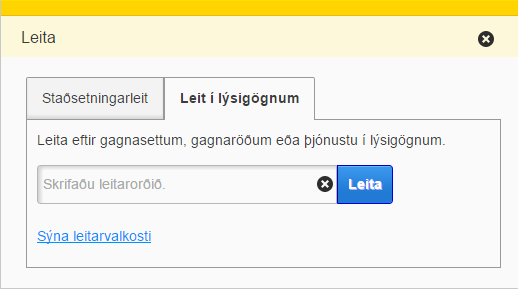 Einnig er hægt að leita í lýsigögnum. Hægt er að leita eftir gagnasettum, gagnaröðum eða þjónustu í lýsigögnum. Hægt er að smella á Sýna leitarvalkosti til þess að fá upp ítarlegri leit.