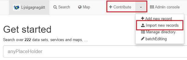 Ef lýsigögnin eru nú þegar fyrir hendi á xlm formati, er hægt að flytja xml skrá lýsigagna inn í Lýsigagnagáttina. Þá velur maður Import new record: