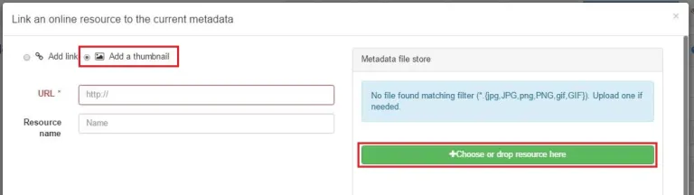Haka við Add a Thumbnail. Áður var búið að útbúa smámynd og vista í vísum stað. Velja því næst Choose or drop resource here: