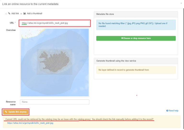Þetta gengur þrátt fyrir skilaboðin sem koma neðst („Current URL…“). Þegar búið er að setja inn slóðina á myndina, er smellt á Update link anyway fyrir neðan gluggann: