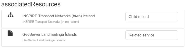 Einnig er hægt að vísa í önnur lýsigögn sem tengjast þessu tiltekna gagnasetti (Child Record/source eða related dataset). Í þessu tilfelli er vísað í gagnasettið INSPIRE Transport Network (tn-ro) Iceland sem á rætur sínar í IS 50V og lýsigögn um GeoServer sem einnig var tengt beint við í listanum hér fyrir ofan.