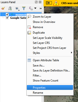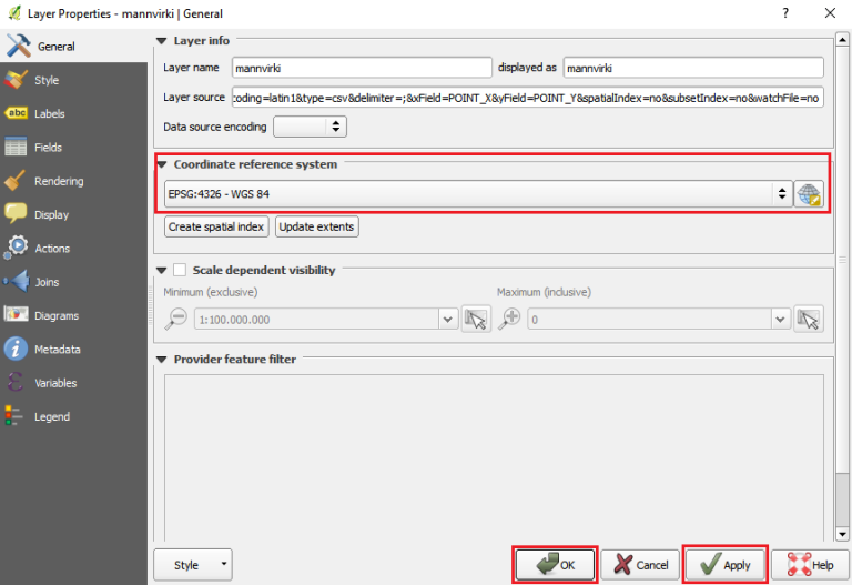 Kortaglugginn gerir ráð fyrir því að gögnin sem verið er að opna séu í sama kerfi og glugginn sjálfur, en þessu er hægt að breyta. Til þess þarf að hægrismella á punktalagið sem á nú að vera komið í Layers Panel, veljið Properties við það opnast Layer Properties valmynd. Strax undir General þarf að velja rétt hnitakefi fyrir gögnin undir Coordinate reference system að því loknu er hægt að loka valmyndinni og þá ættu gögnin að birtast á sínum stað.