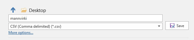 Þegar búið er að stilla töflunni upp er farið í File>Save as> og velja að vista skjalið sem CSV (Comma delimited)(*.csv).