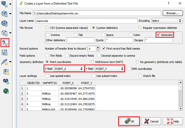 Nú er hægt að opna skjalið í QGIS en það er gert með því að velja kommutáknið í tólastikunni til vinstri. Við það opnast Create a Layer from a Delimited Text File valmynd þar sem þarf að ganga úr skugga um að nokkur skref séu tekin. í þessu dæmi þarf að byrja á því að finna skrána undir Browse, næst er að velja hvernig skránni er skipt upp og í okkar tilfelli eru það semíkommur, en þannig býr Microsoft excel til .csv skár. Skilgreina þarf X fields og Y fields. Fyrir neðan birtist forskoðun af því hvernig eigindataflan muni líta út, ef dálkarnir skiptast ekki rétt eða ef íslenskan er skrítin þarf að fikta sig áfram og prófa að haka í aðra dáka og velja aðra tegund Encoding fyrir tungumálið.