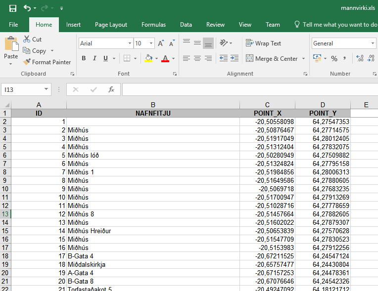 Best er að byrja á að snyrta til gögnin í excel, ákveða hvaða eigindir eiga að fylgja með og passa að hafa nöfn fyrir dálka efst í skjalinu.