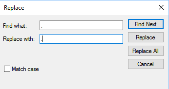 Í Replace valmyndinni sem opnast er sett komma í Find what dálkinn og punktur í Replace with dálkinn, að þessu loknu er hægt að velja Replace All svo framalega sem engar aðrar kommur séu í skjalinu sem ekki mega hverfa. Það getur verið tímafrekt að fara í gegnum hverja kommu fyrir sig með því að velja alltaf Replace en það getur verið góður kostur ef um lítið af gögnum er að ræða. Þegar búið er að skipta kommum í hnitum út fyrir punkta er skjalinu vistað og því lokað.